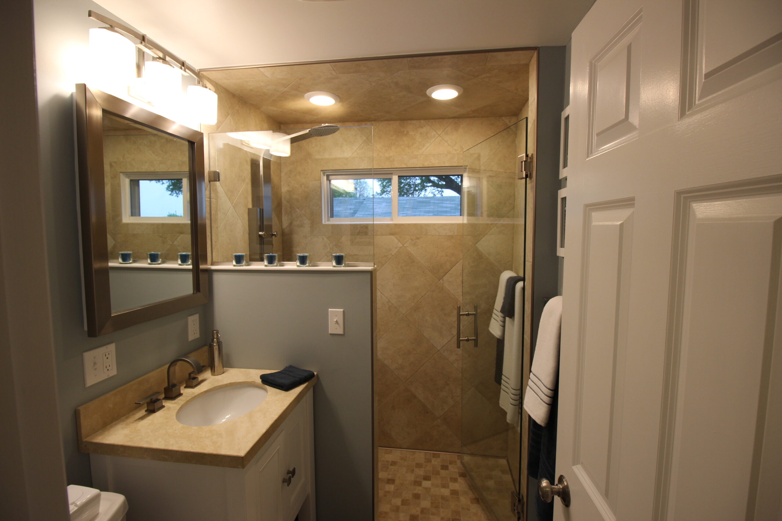 Symmetry was a must in this installation. We framed the window as well as the edges of the shower while centering the Diamond pattern in the remaining space.